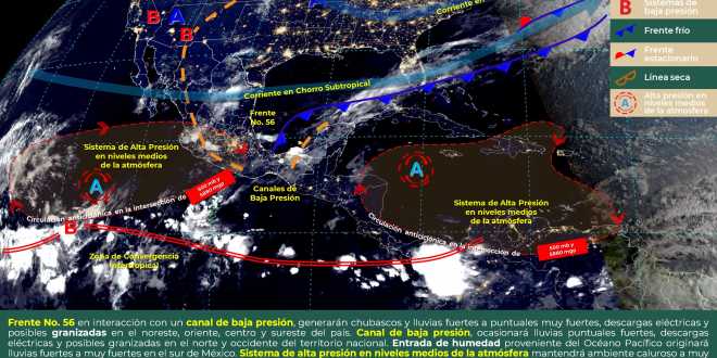 El Instituto de Protección Civil del Estado de Tabasco (IPCET) reporta que el Frente Frío número 56 y la masa de aire que lo impulsa, interactuando con un canal de baja presión y un ingreso de humedad del Pacífico favorecerá lluvias moderadas de 5.1 a 25 milímetros a fuertes aisladas de 25.1 a 50 milímetros, principalmente en La Chontalpa Ríos y Sierra.