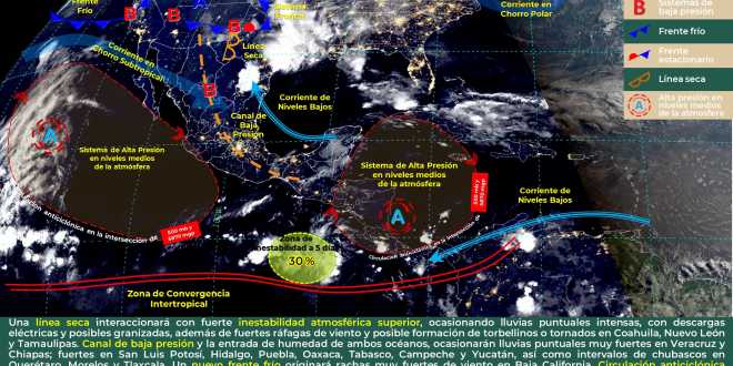 El Instituto de Protección Civil del Estado de Tabasco (IPCET), un canal de baja presión, interactuando con la entrada de humedad del Pacífico y del Caribe, favorecerá lluvias fuertes de 25.1 a 50 milímetros a muy fuertes aisladas de 50.1 a 75 milímetros en Emiliano Zapata, Jonuta, Macuspana, Tacotalpa, Tenosique de manera vespertina y nocturna, acompañadas de actividad eléctrica y vientos arrachados en las zonas de tormenta.