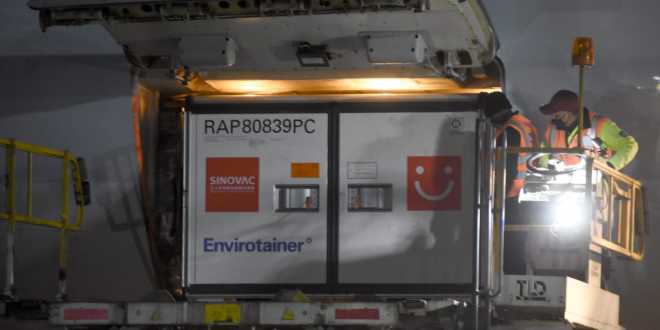 Este noveno cargamento de Sinovac, sumado a los anteriores embarques de este laboratorio, hacen un total de siete millones de dosis.