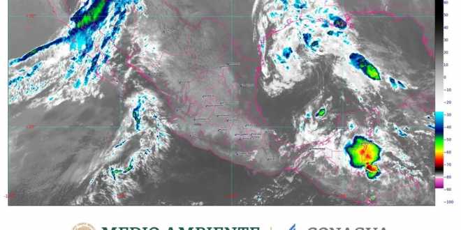 En el Pacífico Sur habrá cielo nublado, ambiente de fresco a templado en la mañana, de cálido a caluroso por la tarde, y viento de dirección variable de 15 a 30 km/h, con rachas de 40 a 50 km/h en zonas con lluvia. Se prevén lluvias muy fuertes en Chiapas y Oaxaca, y aisladas en Guerrero, ambas acompañadas de descargas eléctricas y posible granizo, así como oleaje de 2 a 4 m a lo largo del litoral.