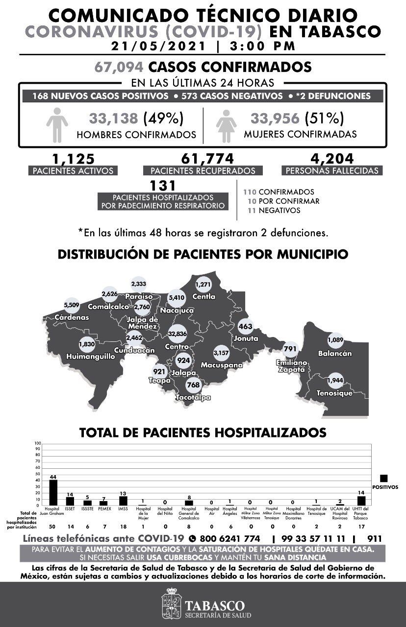 Con la última actualización, Tabasco acumula un total de 67 mil 94 casos confirmados de coronavirus, de los cuales, 33 mil 138 corresponden a hombres (49%) y 33 mil 956 a mujeres (51%). Además, alcanzó 4 mil 204 personas fallecidas.