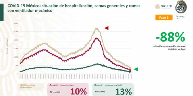 A nivel nacional, 90% de camas de hospitalización general están disponibles y 10% ocupadas. En camas con ventiladores, 87% están disponibles y 13% ocupadas por pacientes graves de #COVID.