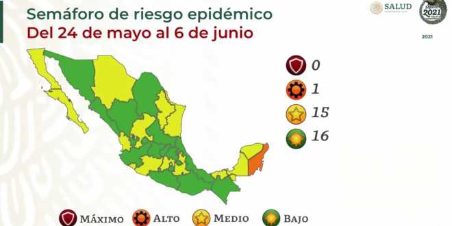 A partir del 24 de mayo se encuentran en semáforo Verde: Aguascalientes, Coahuila, Chiapas, Durango, Guanajuato, Guerrero, Hidalgo, Jalisco, Morelos, Oaxaca, Querétaro, San Luis Potosí, Sinaloa, Sonora, Tlaxcala y Veracruz.