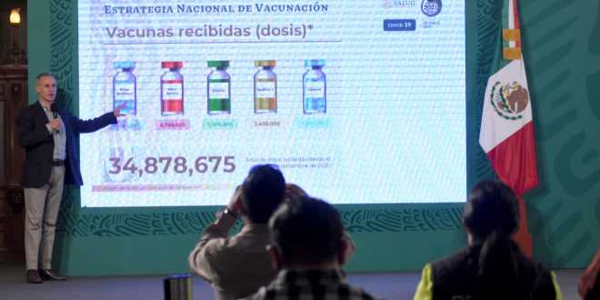 El subsecretario de Prevención y Promoción de la Salud recordó que este miércoles arribó a México un nuevo embarque de Pfizer-BioNTech con 585 mil dosis envasadas y el jueves llegará uno más, para completar esta semana un millón 284 mil 660 biológicos de esta farmacéutica.