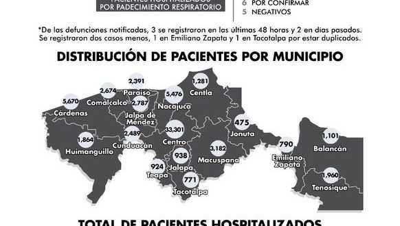 Respecto a la distribución de pacientes por municipio, indica que Centro tiene 33 mil 301 casos positivos; Cárdenas 5 mil 670; Nacajuca, 5 mil 476; Macuspana, 3 mil 182; Jalpa de Méndez, 2 mil 787; Comalcalco, 2 mil 674; y Cunduacán, con 2 mil 489.