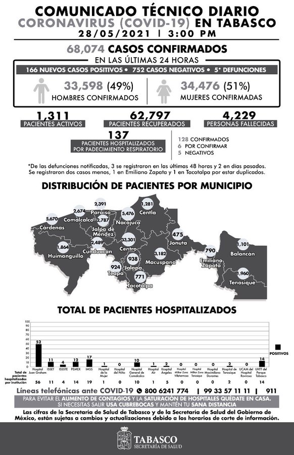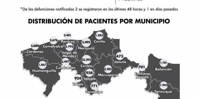 Respecto a la distribución de pacientes por municipio, indica que Centro tiene 33 mil 392 casos positivos; Cárdenas 5 mil 688; Nacajuca, 5 mil 495; Macuspana, 3 mil 182; Jalpa de Méndez, 2 mil 792; Comalcalco, 2 mil 678; y Cunduacán, con 2 mil 497.