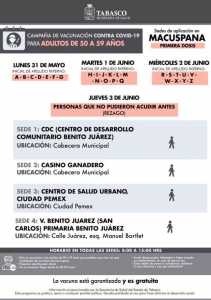 De igual modo se informó que el 31 de mayo al 02 de junio se estaría realizando la aplicación de la primera dosis de la vacuna contra el Covid-19 a los adultos de 50 a 59 años y embarazadas que vivan en Macuspana.