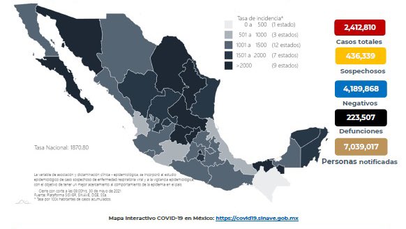 En México hasta el día de hoy se han confirmado 2, 412,810 casos totales y 223,507 defunciones totales por COVID-19.
