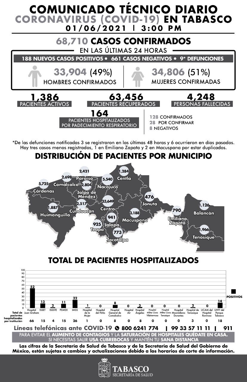 La Secretaría de Salud agregó que en las últimas horas se registraron otras nueve defunciones (tres en las últimas 48 horas y seis en fechas posteriores) lo que incrementa a 4 mil 248 el número de tabasqueños fallecidos a causa de la enfermedad viral.