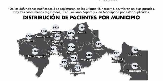 En la distribución de pacientes por municipio, Centro tiene el mayor número de casos, con 33 mil 649, le siguen Cárdenas, con 5 mil 725; Nacajuca, 5 mil 540; Macuspana, 3 mil 188; Jalpa de Méndez, 2 mil 804; Comalcalco, 2 mil 698; Cunduacán, 2 mil 517; y Paraíso, con 2 mil 421.
