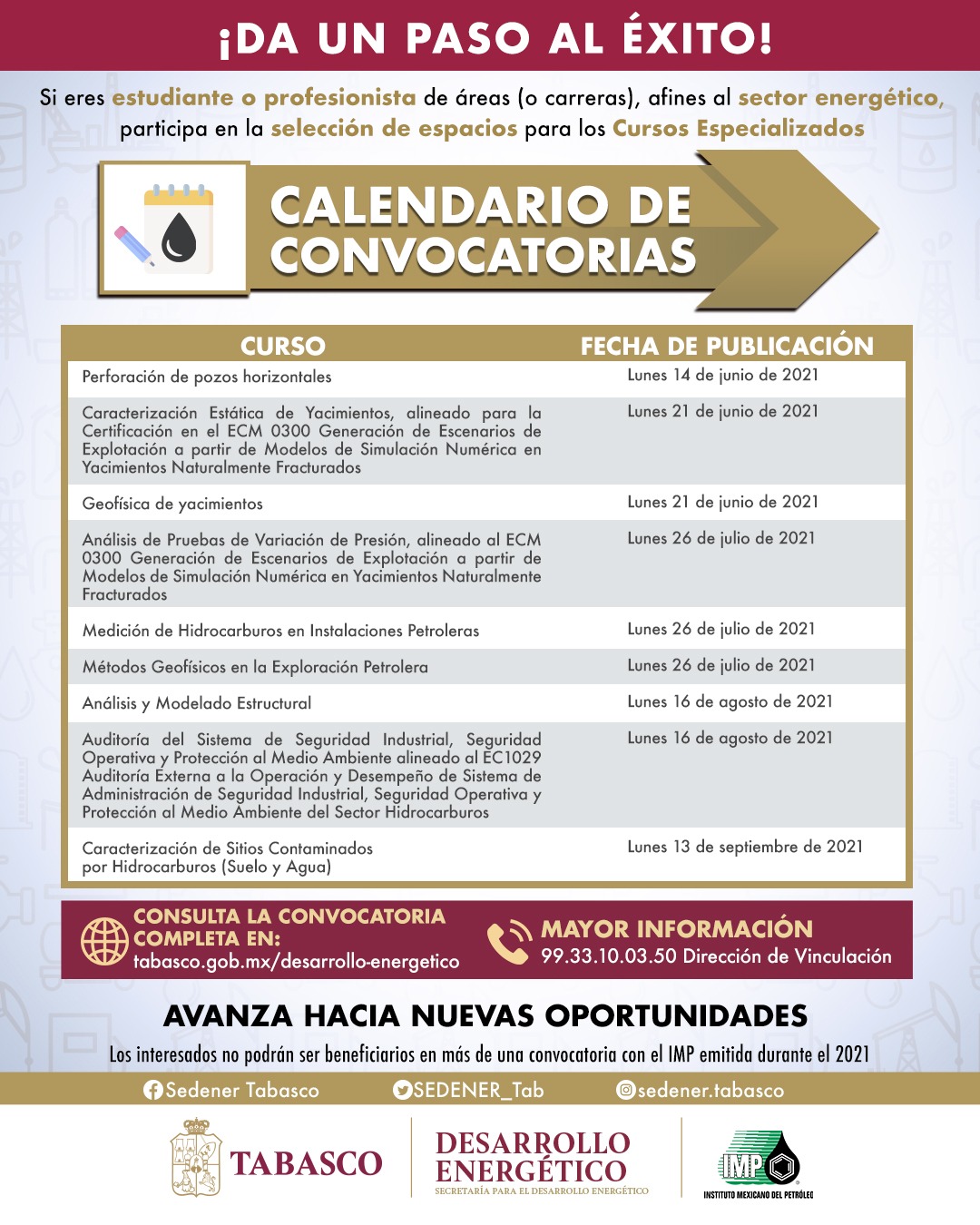 Quienes deseen consultar la convocatoria completa, podrán hacerlo en tabasco.gob.mx/desarrolloenergetico o comunicarse al teléfono, 9933100350 en la dirección de Vinculación de la Sedener.