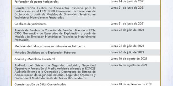 Además para el Análisis y Modelo Estructural la convocatoria se publicará el 16 de agosto; y misma fecha el curso Auditoría del Sistema de Seguridad Industrial, Seguridad Operativa y Protección al Medio Ambiente, alineado al EC1029, Auditoría Externa a la Operación y Desempeño de Sistema de Administración de Seguridad Industrial, Seguridad Operativa y Protección al Medio Ambiente del Sector Hidrocarburos.