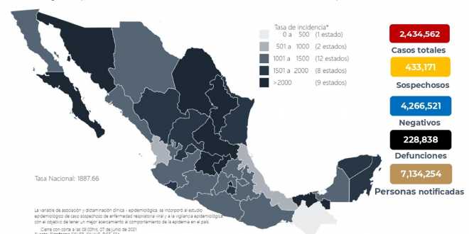En México hasta el día de hoy se han confirmado 2, 434,562 casos totales y 228,838 defunciones totales por COVID-19.