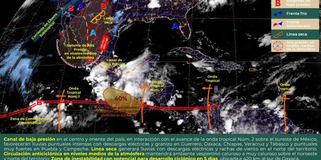 Lo anterior es derivado de la interacción de un canal de baja presión con el avance de la Onda Tropical No 2, que favorecerá un ingreso constante de humedad del Pacífico y del Mar Caribe, precisó el organismo estatal durante su reporte diario.