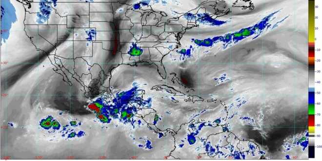 Las condiciones atmosféricas serán originadas por un canal de baja presión ubicado sobre el centro y oriente de México, en interacción con el desplazamiento de la Onda Tropical Número 2 al sureste del país, y por una línea seca que se mantendrá sobre el norte del territorio nacional.