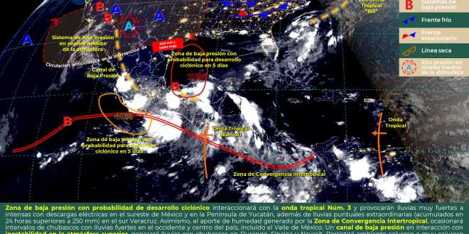 El Instituto de Protección Civil del Estado de Tabasco (IPCET) informó que un aporte constante de humedad por la zona de inestabilidad que prevalece en desarrollo sobre la bahía de Campeche, interactuando con la onda tropical número 3, favorecerá lluvias fuertes a muy fuertes de hasta 75 milímetros en Centro, Chontalpa, en Cárdenas, Huimanguillo y superiores en la región Sierra, Pantanos y Ríos, puede ser incluso superiores de hasta 150 milímetros.