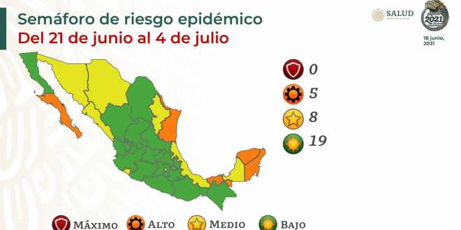 Del 21 de junio al 4 de julio, 19 entidades federativas estarán en verde, ocho en amarillo, cinco en naranja y ninguno en rojo, reporta el informe diario sobre Covid-19, de acuerdo con un comunicado de la Secretaría de Salud.