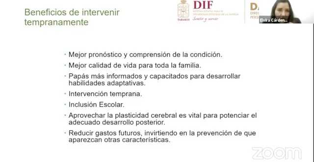 En presencia de la directora de Atención a Personas con Discapacidad (DAPD), Elena Manzanilla Fojaco, enumeró que las ventajas de una detección temprana de un caso es que se reduce la incertidumbre de los padres, ayuda a la identificación de opciones de educación, posibilita el soporte ambiental adecuado, y facilita la convivencia en familiares.