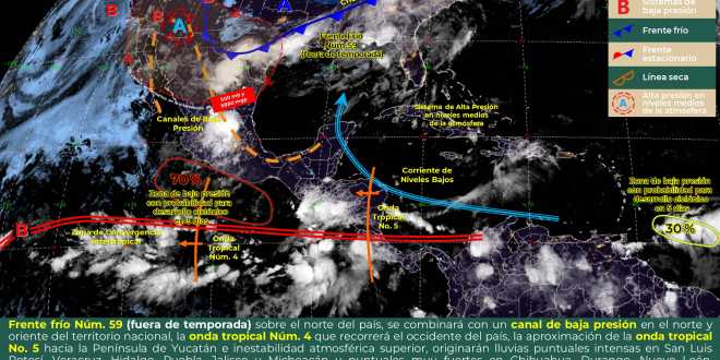 El Instituto de Protección Civil del Estado de Tabasco (IPCET) informó que las precipitaciones pueden darse por un extenso canal de baja presión que prevalecerá sobre la región, interactuando con un aporte de humedad del Pacífico por desprendimientos nubosos de la Zona de Convergencia Intertropical.