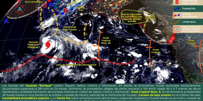 Dio a conocer que estas condiciones en interacción con el desplazamiento de la Onda Tropical Número 6 y un flujo de humedad por la amplia circulación del huracán “Enrique” ubicado al sur de las costas de Baja California Sur, favorecerán precipitaciones que podrían estar acompañadas de actividad eléctrica, durante la tarde y noche.