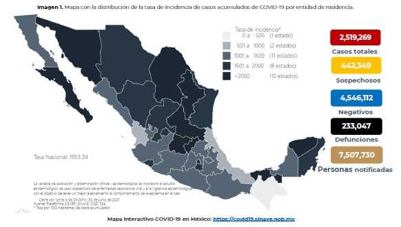 En México hasta el día de hoy se han confirmado 2, 519,269 casos totales y 233, 047 defunciones totales por COVID-19.