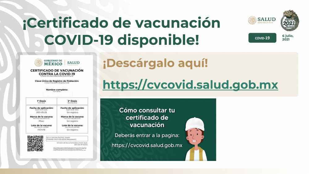 Para comprobar que ha sido vacunado o vacunada contra #COVID19 ya está disponible el certificado de vacunación que puede extraer de la página http://cvcovid.salud.gob.mx.