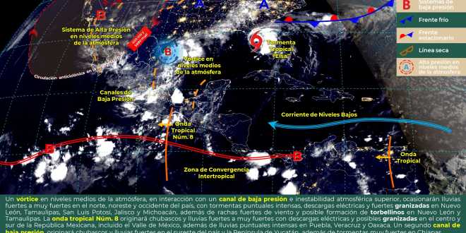 Debido al ingreso de humedad del Pacífico y del Caribe, interactuando con un canal de baja presión en la Península de Yucatán, favorecerán lloviznas de 0.1 a 5 milímetros a lluvias moderadas aisladas de 5.1 a 25 milímetros, en los municipios de Macuspana, Jonuta, Emiliano Zapata y Tenosique, así como en la subregión Sierra.