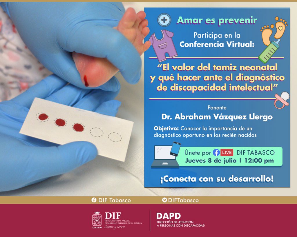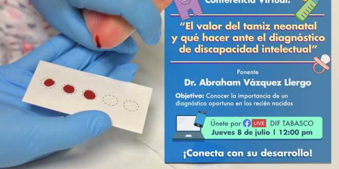 Con el objetivo de conocer la importancia de un diagnóstico oportuno en los recién nacidos para prevenir un daño grave e irreversible, este jueves, el Sistema DIF Tabasco a través de la Dirección de Atención a Personas con Discapacidad (DAPD), realizó la conferencia virtual “El valor del tamiz neonatal y qué hacer ante el diagnóstico de discapacidad intelectual” disertado por el doctor Abraham Vázquez Llergo.