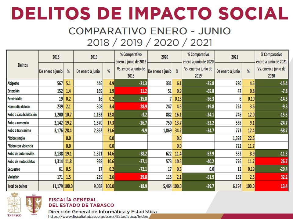 Al corte del primer semestre del año los delitos de impacto social continuaron con una tendencia a la baja en Tabasco, reportándose un 44.5 por ciento menos que los cometidos durante el periodo enero-junio de 2018.