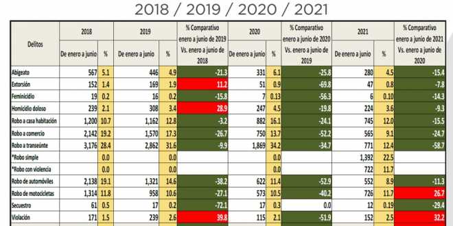 Estas reducciones se hacen tangibles al señalarse que, en comparación con el semestre en mención del último año de la pasada administración, en este 2021 se cometieron 49 casos de secuestro menos; fueron robados 2 mil 174 vehículos menos y se reportaron 1 mil 577 eventos menos de robo a comercio.
