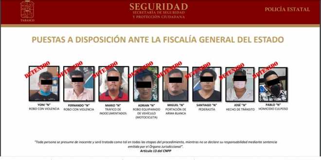 Los delitos por los que fueron puestos ante la autoridad correspodiente son: robo con violencia, robo equiparado de vehículo, portación de arma blanca, pederastía, hechos de tránsito, homicidio y tráfico de indocumentados.
