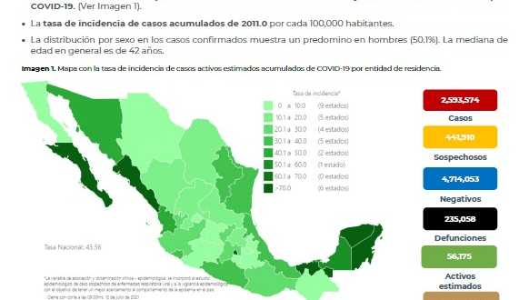 En México hasta el día de hoy se han confirmado 2, 593,574 casos totales y 235,058 defunciones totales por COVID-19.