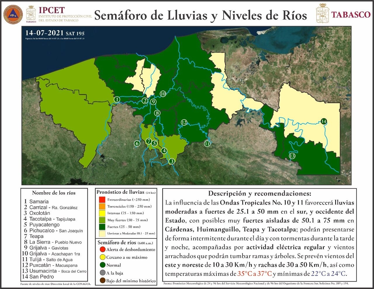 El Instituto de Protección Civil del Estado (IPCET) informa que este miércoles continuará la condición de lluvias y tormentas en el territorio tabasqueño, por lo que se pide a la población tomar medidas preventivas y estar pendiente de los reportes oficiales.