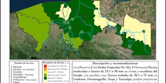 Esta influencia también generará lluvias muy fuertes aisladas de 50.1 a 75 mm en Cárdenas, Huimanguillo, Teapa y Tacotalpa.