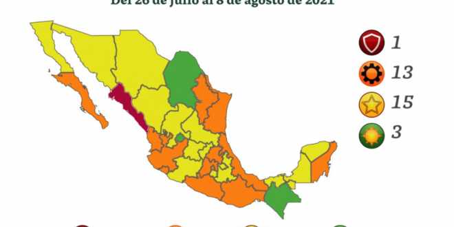 13 entidades del país se ubican en color naranja, que indica riesgo alto de contagio del virus, mientras que 15 están en amarillo de riesgo medio en el semáforo que entrará en vigencia el próximo lunes 26 de julio y hasta el 8 de agosto.