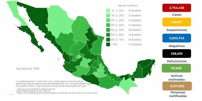 En México hasta el día de hoy se han confirmado 2,754,438 casos totales y 238,595 defunciones totales por