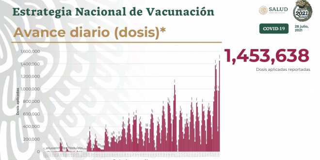Este martes fueron aplicadas un millón 453 mil 638 contra COVID-19 en el país, para un acumulado de 63 millones 313 mil 209 dosis a siete meses de iniciada la vacunación de personas mayores de 18 años, refiere el Informe Técnico COVID-19 de este 28 de julio.