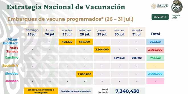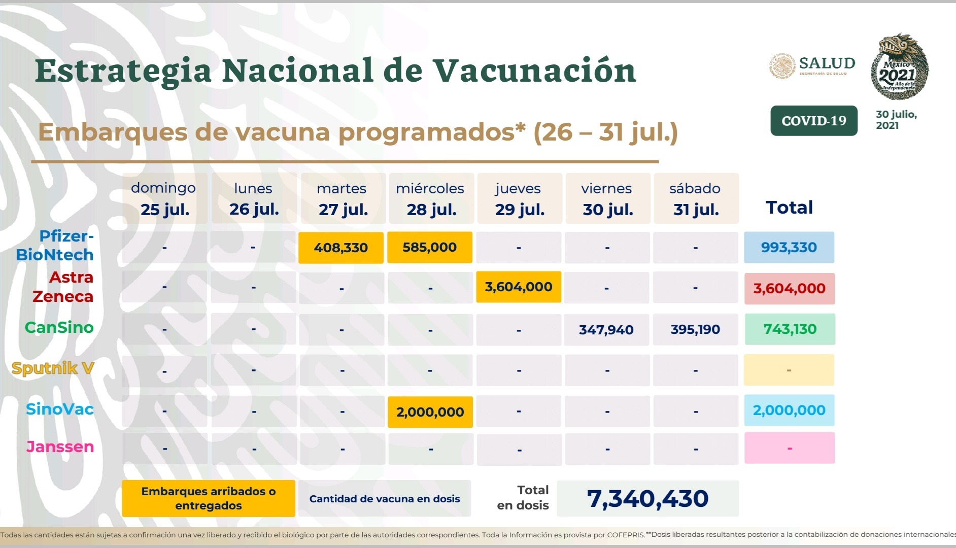 En lo que va de esta semana, México ha sumado seis millones 597 mil 330 dosis envasadas, de un total de siete millones 340 mil 430 programadas de las farmacéuticas Pfizer-BioNTech, AstraZeneca, Cansino y Sinovac.