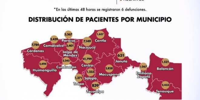 En la distribución de pacientes por municipios, Centro alcanzó 41 mil 799 casos; Cárdenas, 7 mil 784; Nacajuca, 7 mil 149; Macuspana,3 mil 828 casos; Comalcalco, 3 mil 439; Jalpa de Méndez,3 mil 401; Paraíso, 3 mil 367; Cunduacán, 3 mil 245; Huimanguillo, 2 mil 494; Tenosique, 2 mil 433; Centla, mil 637; Balancán, mil 521; Jalapa, mil 233; y Teapa mil 371.