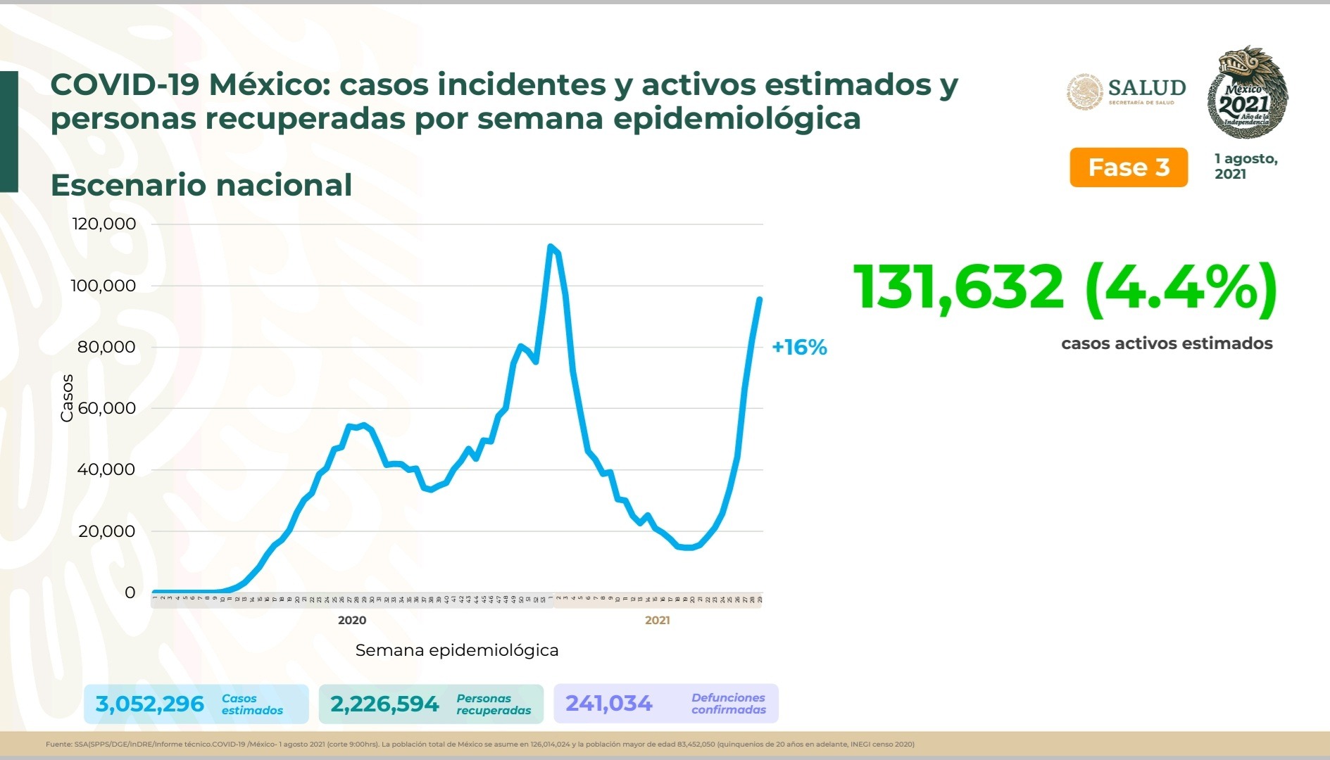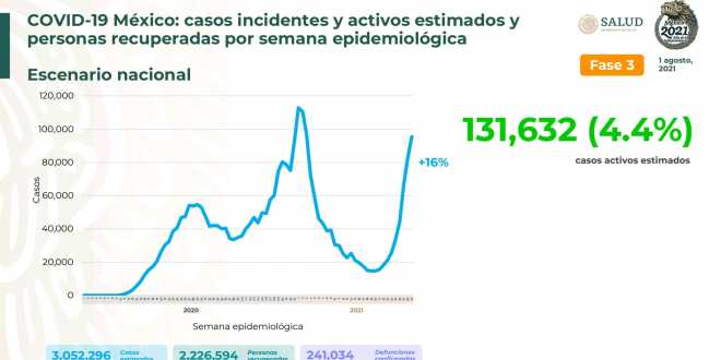 En el inicio de la semana epidemiológica 29, se registra incremento de 16 por ciento en el número de casos estimados en comparación con la semana anterior. Además, se detectaron 131 mil 632 personas con signos y síntomas, quienes representan 4.4 por ciento del total de la epidemia en el país. En tanto, dos millones 226 mil 594 personas se han recuperado de COVID-19.