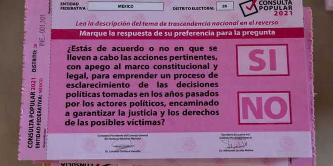 La materia de la consulta llevada a cabo por el Instituto Nacional Electoral (INE), tiene que ver con la contestación sí o no a la pregunta reformulada por la Suprema Corte de Justicia de la Nación que se estableció así: “¿Estás de acuerdo o no en que se lleven a cabo las acciones pertinentes, con apego al marco constitucional y legal, para emprender un proceso de esclarecimiento de las decisiones políticas tomadas en los años pasados por los actores políticos, encaminado a garantizar la justicia y los derechos de las posibles víctimas?”