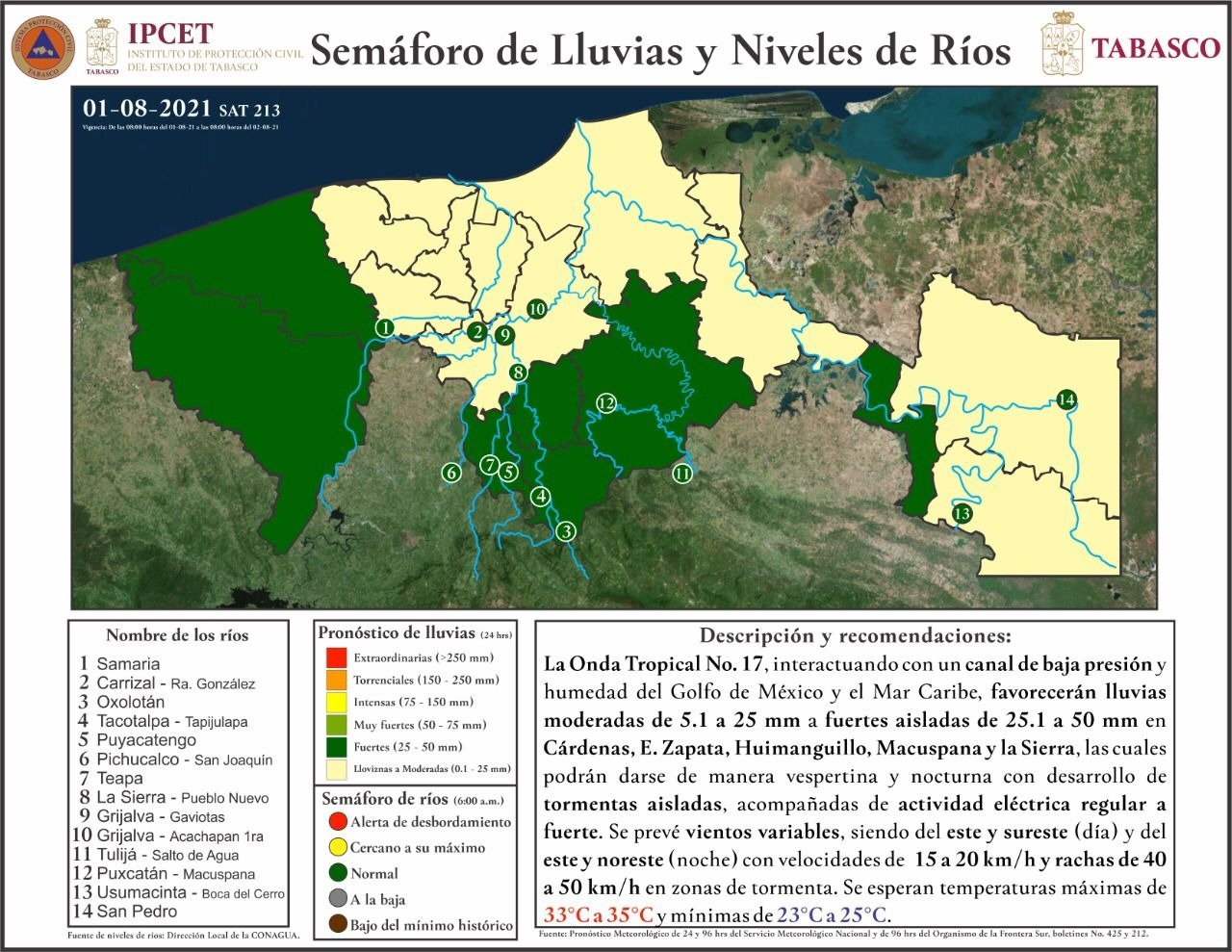 El Instituto de Protección Civil del Estado de Tabasco (IPCET), reporta que la Onda Tropical No. 17, interactuando con un canal de baja presión y humedad del Golfo de México y el Mar Caribe, favorecerán lluvias moderadas de 5.1 a 25 milímetros a fuertes aisladas de 25.1 a 50 milímetros, en Cárdenas, Emiliano Zapata, Huimanguillo, Macuspana y La Sierra.