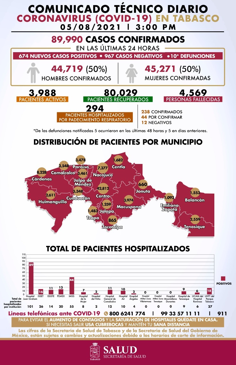 Respecto al total de pacientes hospitalizados, 101 se encuentran en el Hospital Regional de Alta Especialidad “Dr. Juan Graham Casasús”, 55 en el Instituto Mexicano del Seguro Social (IMSS), 27 en la Unidad de Hospitalización Temprana del Parque Tabasco (UHTT), 26 en el Centro de Especialidades Médicas del Instituto de Seguridad Social del Estado de Tabasco (ISSET), 20 en el Hospital Regional de Petróleos Mexicanos (Pemex), 14 están en el Hospital del Instituto de Servicios y Seguridad Social para los Trabajadores del Estado (ISSSTE), 12 en el Hospital General de Comalcalco y 10 en el Hospital Air.