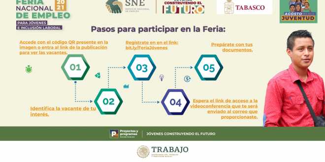 La Secretaría de Gobierno a través del Servicio Estatal de Empleo Tabasco (SNET), realizarán del 11 al 13 de agosto la primera «Feria Nacional de Empleo 2021 para Jóvenes e Inclusión Laboral».