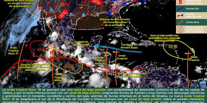 Explicó que canales de baja presión mantendrán el potencial de lluvias fuertes con tormentas, actividad eléctrica y vientos arrachados que podrán generar caída de ramas y árboles. La alta actividad de tormenta es probable que se dé en el Sur de la Sierra y los límites con el estado de Veracruz.