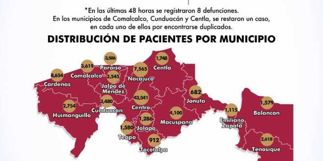 En cuanto a la distribución de pacientes por municipios, Centro, el municipio con el mayor número de contagios sumó 43 mil 541 casos; le sigue Cárdenas con 8 mil 654; Nacajuca, 7 mil 565; Macuspana, 4 mil 100; Comalcalco, 3 mil 619; Jalpa de Méndez, 3 mil 545; Paraíso, 3 mil 586.