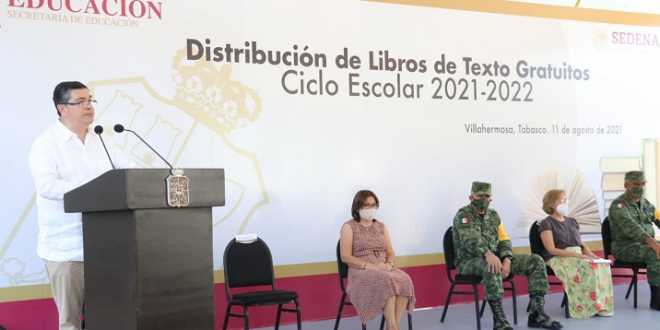 Al encabezar en representación del gobernador Adán Augusto López Hernández, la ceremonia de distribución de los Libros de Textos Gratuitos para el Ciclo Escolar 2021-2022, De la Vega Asmitia indicó que con el reparto del material bibliográfico, el Gobierno del Estado a través de la Secretaría de Educación, avanza en el objetivo de retornar gradualmente a las aulas.
