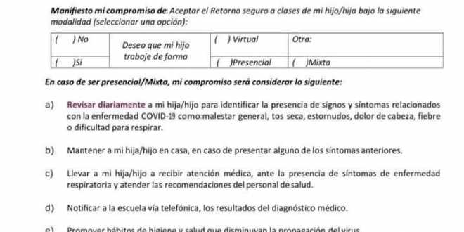 ¿Cómo es la carta compromiso? En el primer apartado, los padres deberán colocar la fecha, sus datos personales y del estudiante, así como aclarar la modalidad en que sus hijos tomarán clase. “Manifiesto mi compromiso de aceptar el retorno seguro a clases de mi hijo/hija bajo la siguiente modalidad» se lee arriba de un recuadro con las opciones no o sí.