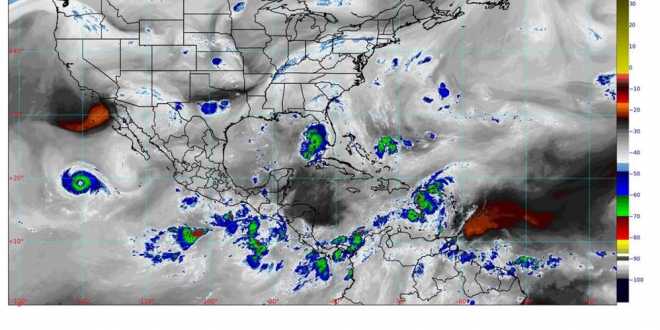 Para hoy, se pronostican lluvias intensas (de 75.1 a 150. milímetros [mm]) en áreas de Chiapas; muy fuertes (de 50.1 a 75 mm) en zonas de Campeche, Chihuahua, Colima, Durango, Jalisco, Michoacán, Oaxaca, Sinaloa, Sonora, Tabasco y Yucatán; fuertes (de 25.1 a 50 mm) en sitios del Estado de México, Guerrero, Nayarit, Puebla, Veracruz y Quintana Roo; intervalos de chubascos (de 5.1 a 25 mm) en áreas de Baja California, Ciudad de México, Coahuila, Guanajuato, Morelos, Nuevo León, San Luis Potosí, Tamaulipas y Zacatecas, así como lluvias aisladas (de 0.1 a 5 mm) en Aguascalientes, Baja California Sur, Hidalgo, Querétaro y Tlaxcala.