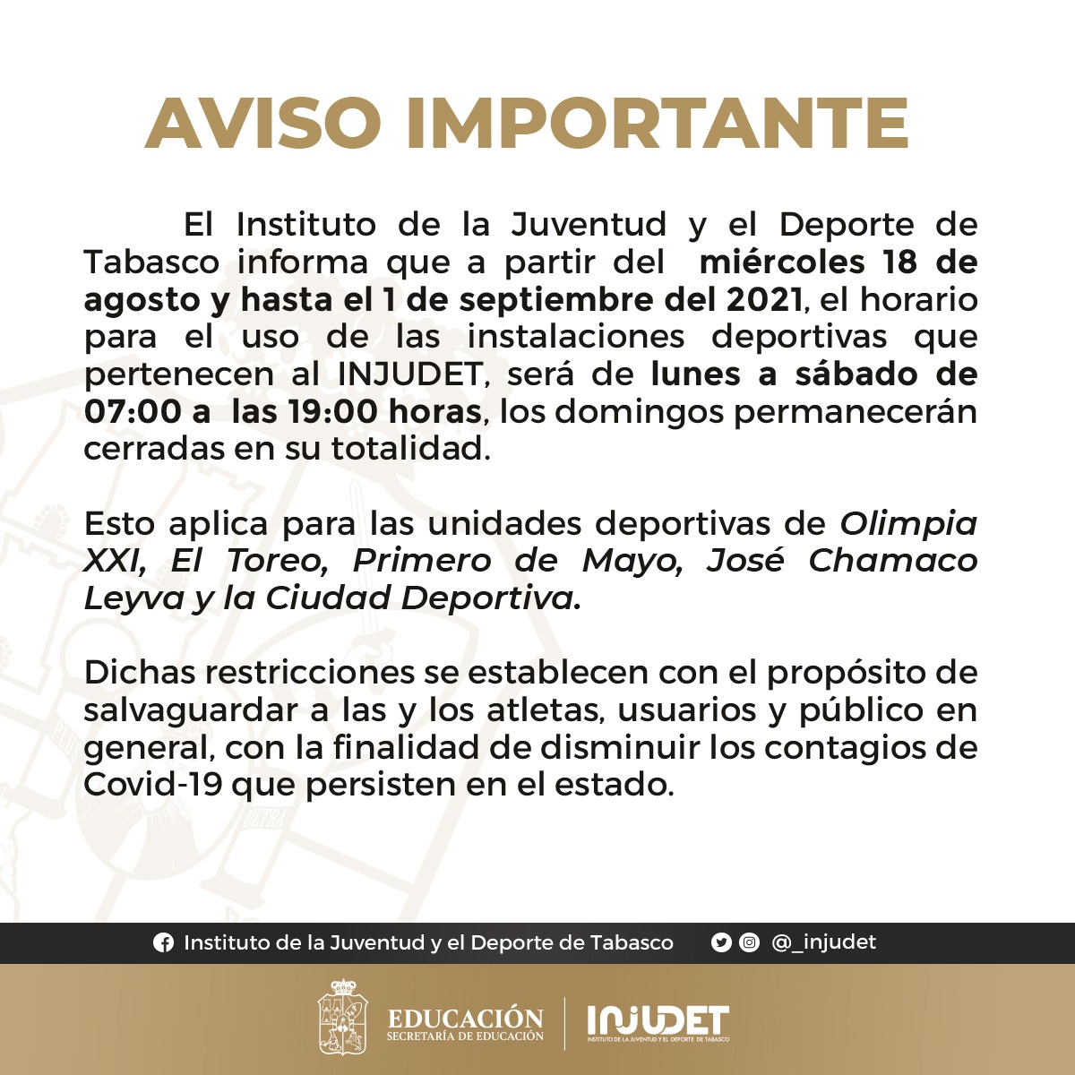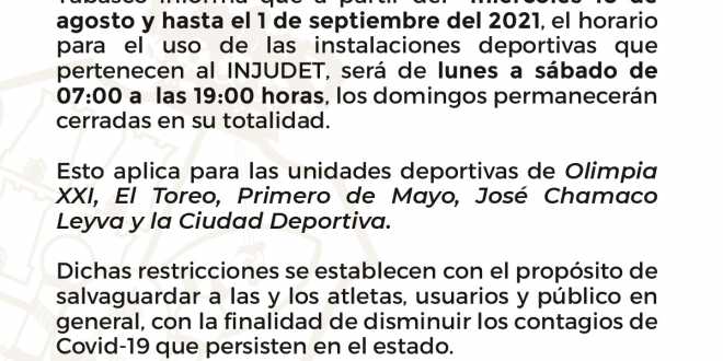 Con la finalidad de disminuir el índice de contagios de COVID-19 en la entidad, el Instituto de la Juventud y el Deporte de Tabasco (Injudet), emitió este día nuevas disposiciones para el horario y uso de las instalaciones deportivas que administra la dependencia.